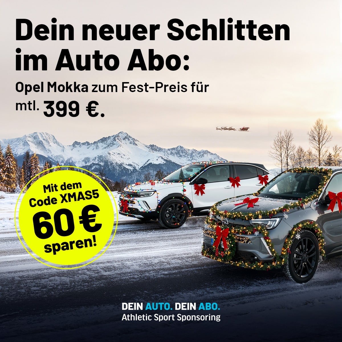 Mit dem fairen Auto Abo unseres Partners Athletic Sport Sponsoring kommst du zuverlässig durch die kalte Jahreszeit. Jetzt zum Fest-Preis: Opel Mokka für 399 € monatlich – all inclusive.